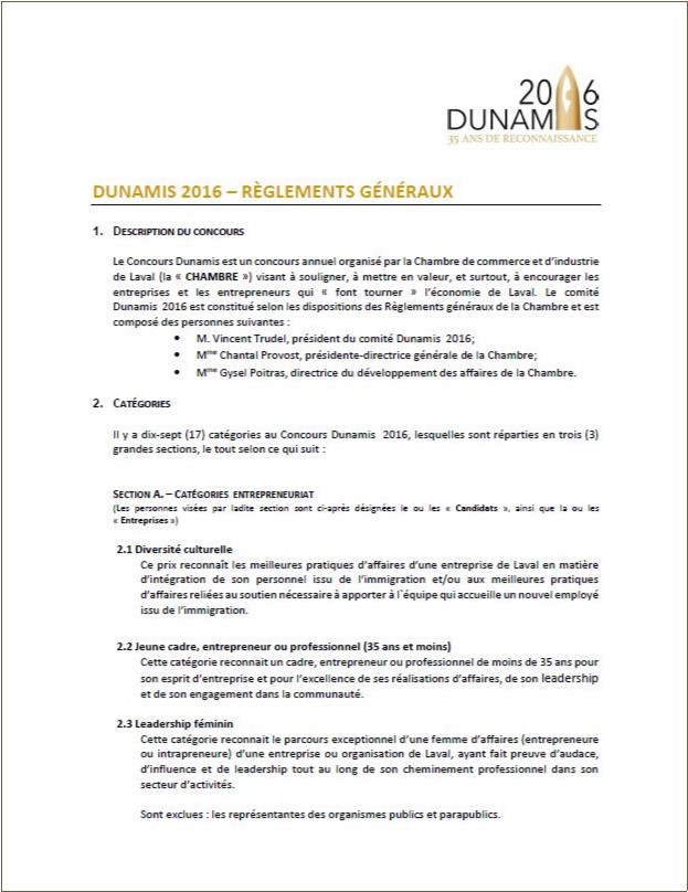 Le Concours Dunamis est un concours annuel organisé par la Chambre de commerce et d’industrie de Laval (la « CHAMBRE ») visant à souligner, à mettre en valeur, et surtout, à encourager les entreprises et les entrepreneurs qui « font tourner » l’économie de Laval. Le comité Dunamis 2016 est constitué selon les dispositions des Règlements généraux de la Chambre et est composé des personnes suivantes :